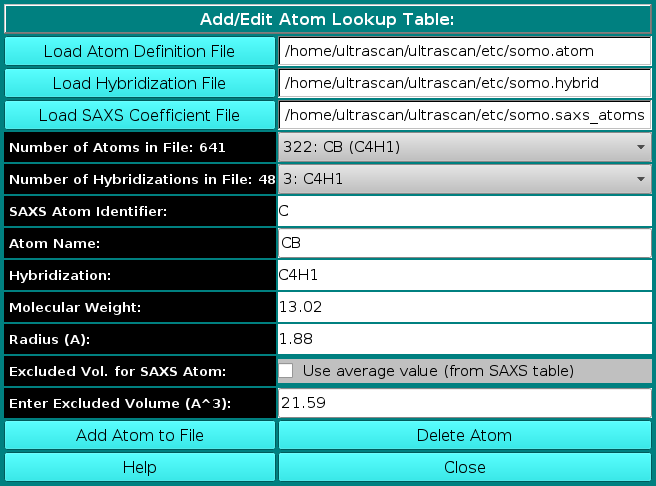 lookup tables for different conditions. The lookup table needs to contain all atoms and residues present in the (macro)molecule to be loaded in the next step. By default, US-SOMO will automatically load the last used *.residue table.