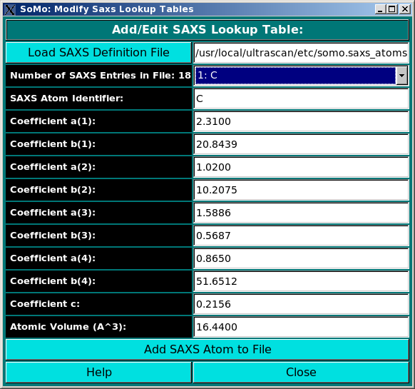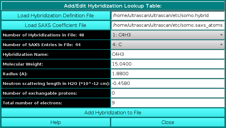 On launching, US-SOMO will automatically load the last used lookup table (default: somo.residue), where all the informations needed to convert the residues present in atomic structures into beads are stored. To select a different lookup table, click on Select Lookup Table. You can create multiple
