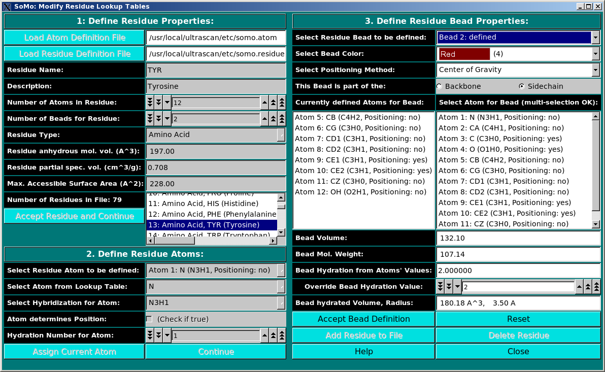 The program main window contains an upper bar from which all the options governing its operations can be controlled, and a main panel for program execution. However, due to its high level of sophistication, properly setting all the available options can be non-trivial for the general user. Therefore, the US-SOMO module is distributed with pre-defined default options that should allow the direct conversion of a PDB-formatted biomacromolecular structure file into a bead model, and the computation of its hydrodynamic properties, without the need of accessing the advanced options menus. In particular, the workhorse SoMo approach, either with or without overlaps removal (the latter now being the preferred option since the ZENO and GRPY implementation) is based on properly defining the atoms and residues found in PDB files, and the rules allowing their conversion into beads. These rules also apply for the vdW bead models. The US-SOMO distribution includes the definition of all the standard amino acids, nucleotides, carbohydrates, and common prosthetic groups and co-factors, but this list is by no means exhaustive, and the need to code for "new" residues is not a remote possibility. As this operation can be demanding, notwithstanding the user-friendly GUIs governing it, the pre-defined set of options includes approximate methods to deal with either missing atoms within coded residues, and/or not yet coded residues. Starting from the May 2015 release, the default option for SoMo models is to generate a single bead for each non-coded residue using average parameters. When non-coded residues are found, a pop-up panel will alert the user and present as options (i) to continue with the approximate method; (ii) to skip non-coded residues (not recommended), or (iii) to halt operations and then take proper action like coding for the new residue. For coded residues with missing atoms, since most often this is due to lack of crystallographic data, the SoMo bead modeling method default option is now to use the complete residue's bead(s), appropriately positioned (again, a pop-up panel will warn of such instances and present the alternative skip (not recommended) or halt operations options). Obviously, there's no cure for completely missing residues, which will have to be built in the original structure for reliable results, since the structure should contain all residues and atoms that are present in the "real" macromolecule studied in solution. This applies also for missing atoms if vdW models are to be used. Therefore, for best performance all residues should be properly coded in the US-SOMO tables (see below).